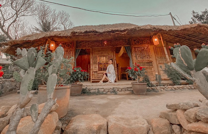 Ngoài ra, trong làng vẫn còn những ngôi nhà với mái lợp lá cọ, tường và cửa được làm hoàn toàn bằng tre, nứa, cùng những bộ bàn ghế bằng gỗ mộc mạc đơn sơ, điểm tô một vài dải đèn lồng được đan bằng mây, xung quanh đầy cây cối hoa lá rực rỡ màu sắc, mang đến một màu sắc cổ kính trầm mặc tựa như bối cảnh trong phim cổ trang mà chúng ta hay xem trên tivi vậy.