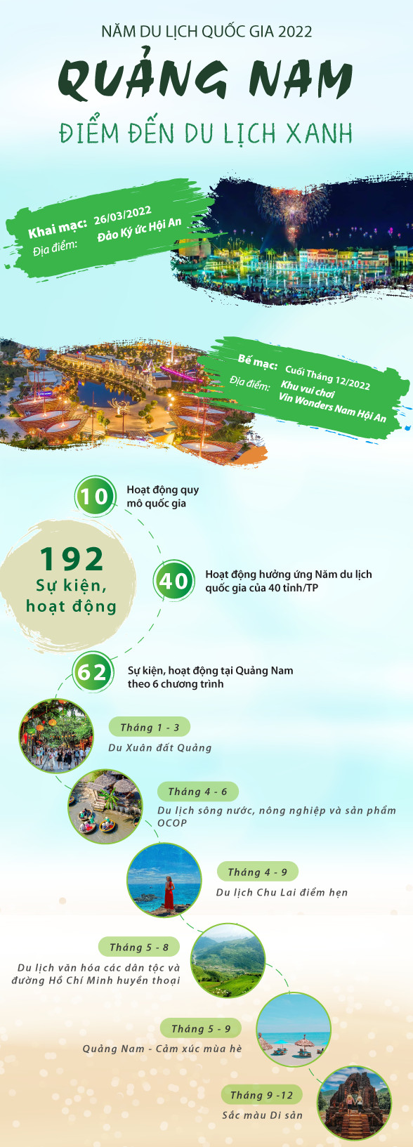 Năm Du lịch Quốc gia - Quảng Nam 2022 với hơn 192 sự kiện, hoạt động xuyên suốt năm đều gắn với đặc trưng bản địa và du lịch xanh, mang đến cho người dân và du khách những trải nghiệm ý nghĩa làm nổi bật chủ đề và mục tiêu của Năm du lịch quốc gia. Trong đó có 10 hoạt động tầm quốc gia do Bộ Văn hóa, Thể thao và Du lịch, các bộ, ban, ngành Trung ương tổ chức; tỉnh Quảng Nam chủ trì tổ chức chuỗi 62 sự kiện, hoạt động đặc sắc, hấp dẫn theo 6 chương trình diễn ra xuyên suốt năm 2022.