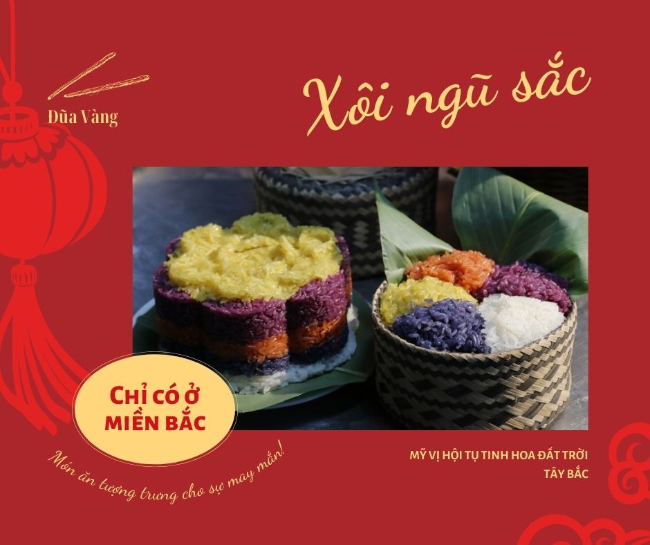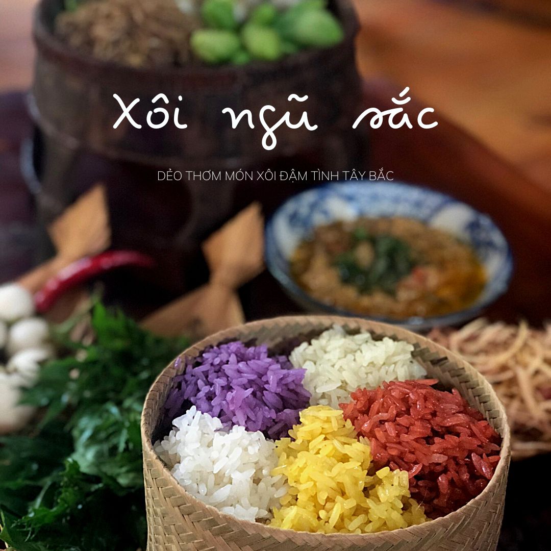 Nếu có dịp đến thăm các tỉnh miền núi phía Bắc, không khó để bạn bắt gặp chõ xôi ngũ sắc thơm nức còn đang nghi ngút khói trong gian bếp của đồng bào vùng cao nào đó. Là món xôi tượng trưng cho ngũ hành (kim, mộc, thủy, hỏa, thổ) với 5 màu khác nhau: trắng, đỏ, xanh, tím, vàng; xôi ngũ sắc không chỉ là món ăn hấp dẫn được dùng trong nhiều dịp cỗ bàn, lễ chạp mà còn đó bao ý nghĩa đặc biệt sâu sa. Món xôi này thể hiện cho lòng yêu mẹ kính cha; tình yêu son sắt đôi lứa và cũng là tượng trưng cho những điều may mắn hạnh phúc.