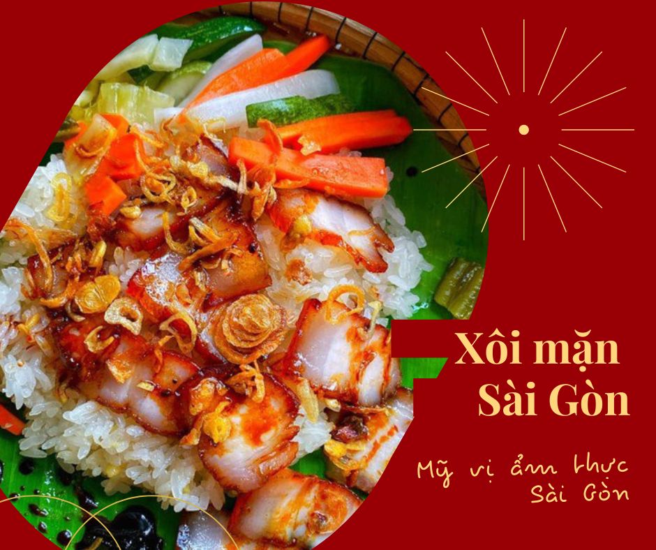 Có lẽ chỉ có ở Sài Gòn, bạn có thể bắt gặp nhiều hàng quán vỉa hè bán xôi mặn đến như vậy. Mỗi hàng mang sắc thái độc đáo khác nhau, nhưng tựu chung lại đều tạo nên món xôi mặn thơm ngon, quyến rũ vô cùng. Nếu ngoài miền Bắc, bát xôi trắng nóng hổi thường được rưới kèm nước thịt kho ngọt thơm đậm đà thì ở miền Nam, xôi mặn là sự kết hợp hoàn hảo với bát xôi nóng dọn kèm nước sốt đặc biệt. Hạt xôi mềm tơi dẻo thơm ăn với các loại nhân ăn kèm thơm ngon như xá xíu, lạp xưởng, pate, ruốc, gà xé… đều khiến các tín đồ ẩm thực cũng phải thích mê.