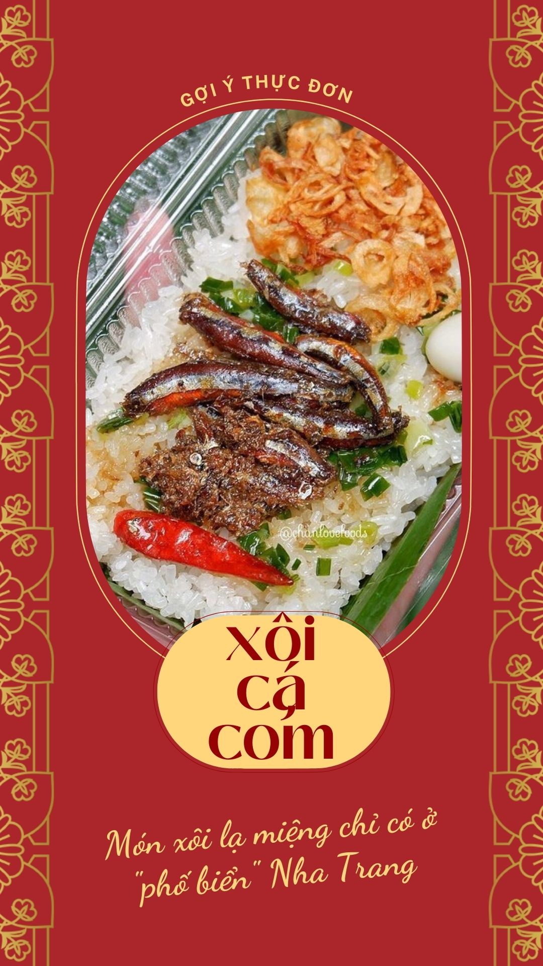 Vốn là món ăn sáng phổ biến với người dân Nha Trang, xôi cá cơm của người Nha Trang cũng đơn giản, chỉ có xôi trắng dẻo mềm, ăn kèm cá cơm rim gia vị mềm thơm, trứng cút luộc, hành phi bùi béo và rưới chút nước rim cá đậm đà, thế là xong. Món ăn này không nêm nếm nhiều gia vị mà chỉ nêm chút muối rồi hấp với lá dứa để tạo mùi thơm tự nhiên cho xôi.