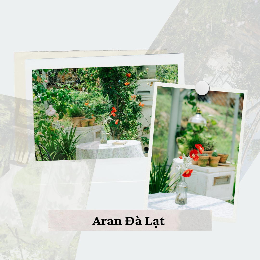 Quán cafe mới đầu tiên được nhắc tới trong danh sách này chính là Aran - nơi ở của nàng tiểu thư ở biệt thự đài các nhưng lại nằm trong hẻm. Từ ngoài phố nhộn nhịp lui vào trong con ngõ nhỏ, đến với Aran chúng ta như được gặp lại bản thân mình thời thơ bé. Khi đó mỗi người đều sở hữu những ước mơ thật to lớn làm nghề này nghề kia, được trở thành hoàng tử/ công chúa - đóng vai chính trong bộ phim của cuộc đời. Aran dường như hiểu được ước nguyện được trốn chạy cuộc sống xoay ngược thời gian của mọi người, mà hóa thành nơi ôm ấp những tâm tư và nguyện vọng ấy. Đến với Aran là được hòa mình với thiên nhiên, với màu xanh của cỏ cây mây trời.