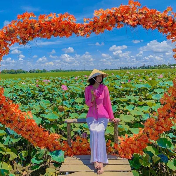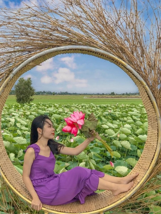 Thấu hiểu tâm lý khách hàng, chủ nông trại đã bố trí nhiều tiểu cảnh xinh xắn bên bờ ao sen để phục vụ nhu cầu chụp ảnh sống ảo của du khách. Đa phần những tiểu cảnh được tạo nên từ gỗ, thân cây, lá dừa… rất mộc mạc. Xen lẫn vào đó là màu hồng của hoa sen và xanh của lá khiến cho khung cảnh check - in trở nên ảo diệu hơn.