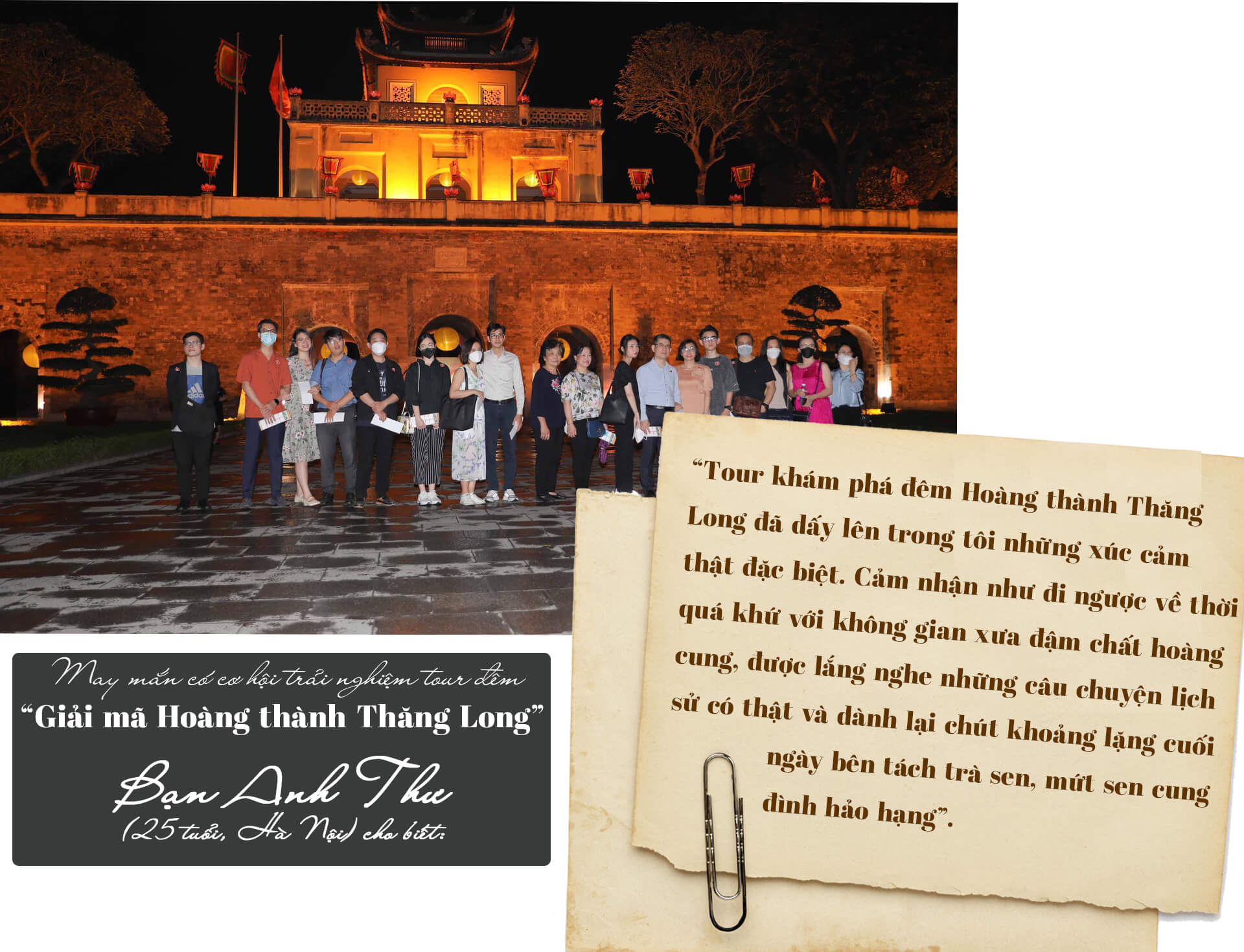 Chưa hết, còn có một điểm thú vị trong tour chính là trò chơi có tên “Giải mã Hoàng thành Thăng Long”. Móc nối từng tấm thẻ gợi ý tại nhiều điểm khác nhau, bạn sẽ thấu hiểu điều mà ban tổ chức tour muốn nhắn gửi là gì. Để rồi hành trình khép lại, cảm giác nghỉ ngơi thư thái bên ấm trà sen ấm nóng, cùng thưởng thức mứt sen ngay dưới tán cây bồ đề cổ thụ, sẽ thật sự an nhiên và tĩnh tâm ra sao.
