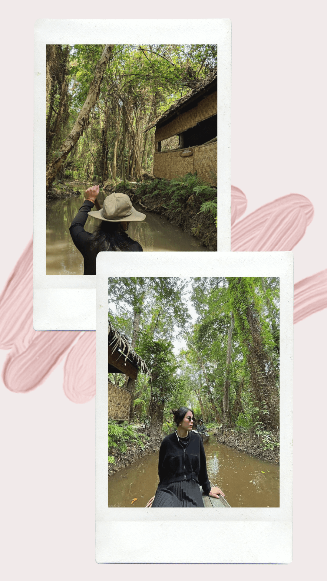 Ngoài ra, đi thuyền lá len lỏi quanh khu rừng tràm ngập nước, bốn bề bao phủ lớp bèo xanh mướt cũng là một gợi ý không tồi. Ngồi trên con thuyền trôi chầm chậm trên mặt nước êm đềm tĩnh lặng, đâu đó lấp ló vài tia nắng đan xen lọt xuống, dường như mọi vướng bận, bon chen ngày thường bỗng nhiên biến mất, chỉ còn đó tâm trạng an yên đến lạ thường. Hành trình khép lại ở điểm kết thúc cuối cùng, khi bạn được đặt chân đến những di tích lịch sử anh hùng lẩn khuất trong rừng tràm mênh mông đầy rẫy những bí ẩn.