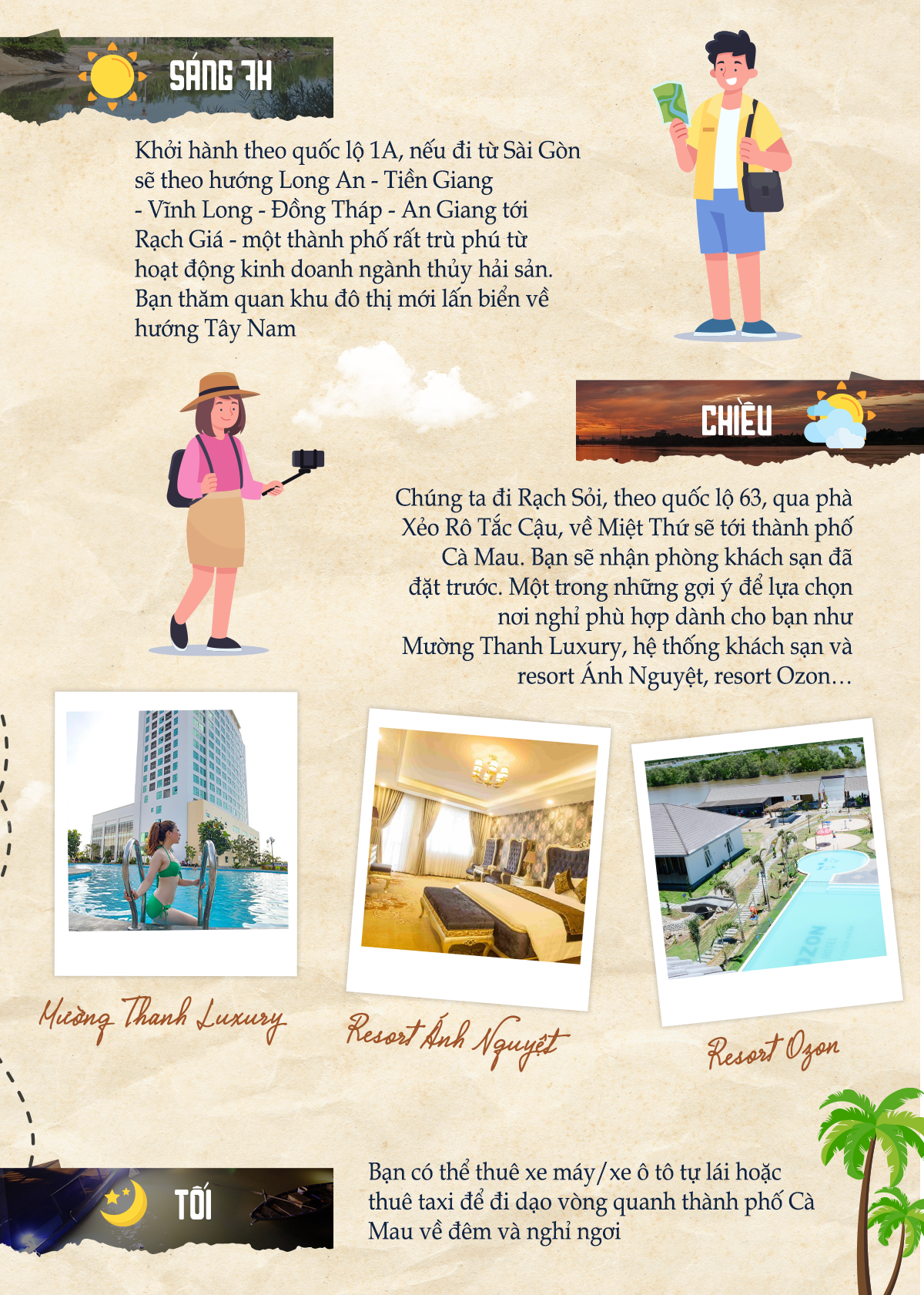 Mở đầu hành trình 4 ngày 3 đêm sống trọn vẹn vùng Tây sông nước, cũng là lúc bạn khởi hành từ thành phố nơi đang sống thong dong xuôi về Cà Mau - miền đất cuối trời cực Nam; nơi cùng với Đồng Văn, Hà Giang vẽ thành một đường thẳng dài nối liền hai đầu Tổ quốc lại với nhau. Được mệnh danh là vùng đất trẻ, rất trẻ, Cà Mau luôn hiện hữu nét hoang sơ mà phì nhiêu, bởi ở đó có rừng xanh bạt ngàn và phù sa bồi đắp từ ba bề đại dương ôm ấp.