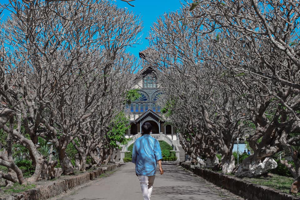 Một nơi chắc chắn phải đến nếu bạn muốn chụp được những bức ảnh đẹp. Tòa Giám Mục sẽ cho vào thăm quan vào chủ nhật hàng tuần, mình đi vào thứ 7, nên chỉ xin phép chụp ảnh ở ngoài được, nhưng mà trời ơi, bên ngoài thôi nó cũng đẹp lắm ấy, hai bên là hai hàng cây hoa đại, sâu đằng xa là một tòa nhà, nhìn phong cách hơi kiểu lâu đài ma cà rồng. Tòa giám mục nằm ngay trong thành phố, khá gần nhà rông Kon Klor, ngay gần đó là nhà thờ chính tòa Kontum, nên chúng mình cũng tiện đi được hết trong 1 buổi sáng.