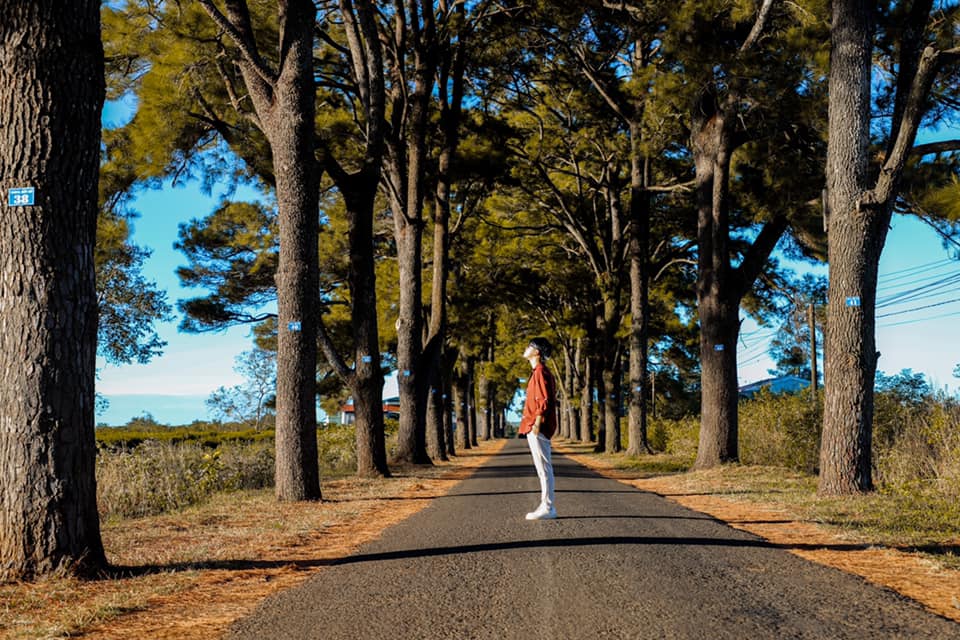 Một địa điểm nổi tiếng ở PleiKu, bạn lên bản đồ tra “Hàng thông trăm tuổi” là thấy. Nơi đây là 1 con đường, hai bên là hai hàng cây thông cao vút, “cánh đồng” trồng chè. Chúng mình qua lần đầu vào 15:00 chiều, ở đây khá đông, nên mình đã quay lại đây vào lúc 6h sáng hôm sau.