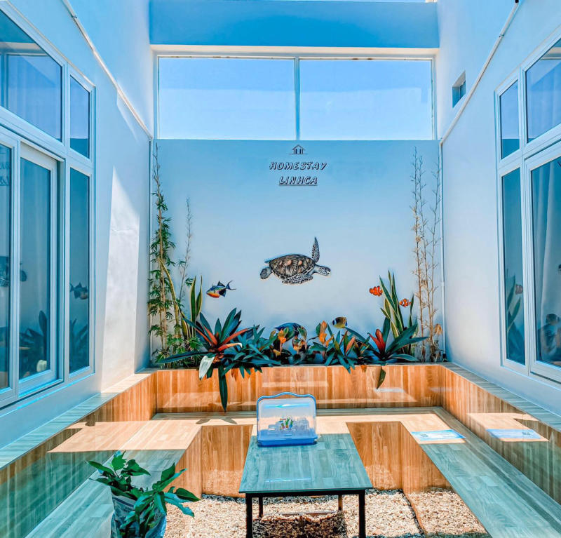 Nếu đi du lịch đông người thì thay vì thuê khách sạn Đảo Phú Quý, bạn có thể cân nhắc lựa chọn thuê cả một căn homestay rộng rãi. Trong đó, Linh Ca Homestay khoác lên mình phong cách Costal mang âm hưởng từ biển cả sẽ là điểm dừng chân lý tưởng. Khắp nơi tại đây đều được thiết kế tỉ mỉ từ màu sắc, cách trang trí nhằm tạo nên được một đại dương thu nhỏ ngay bên trong homestay.