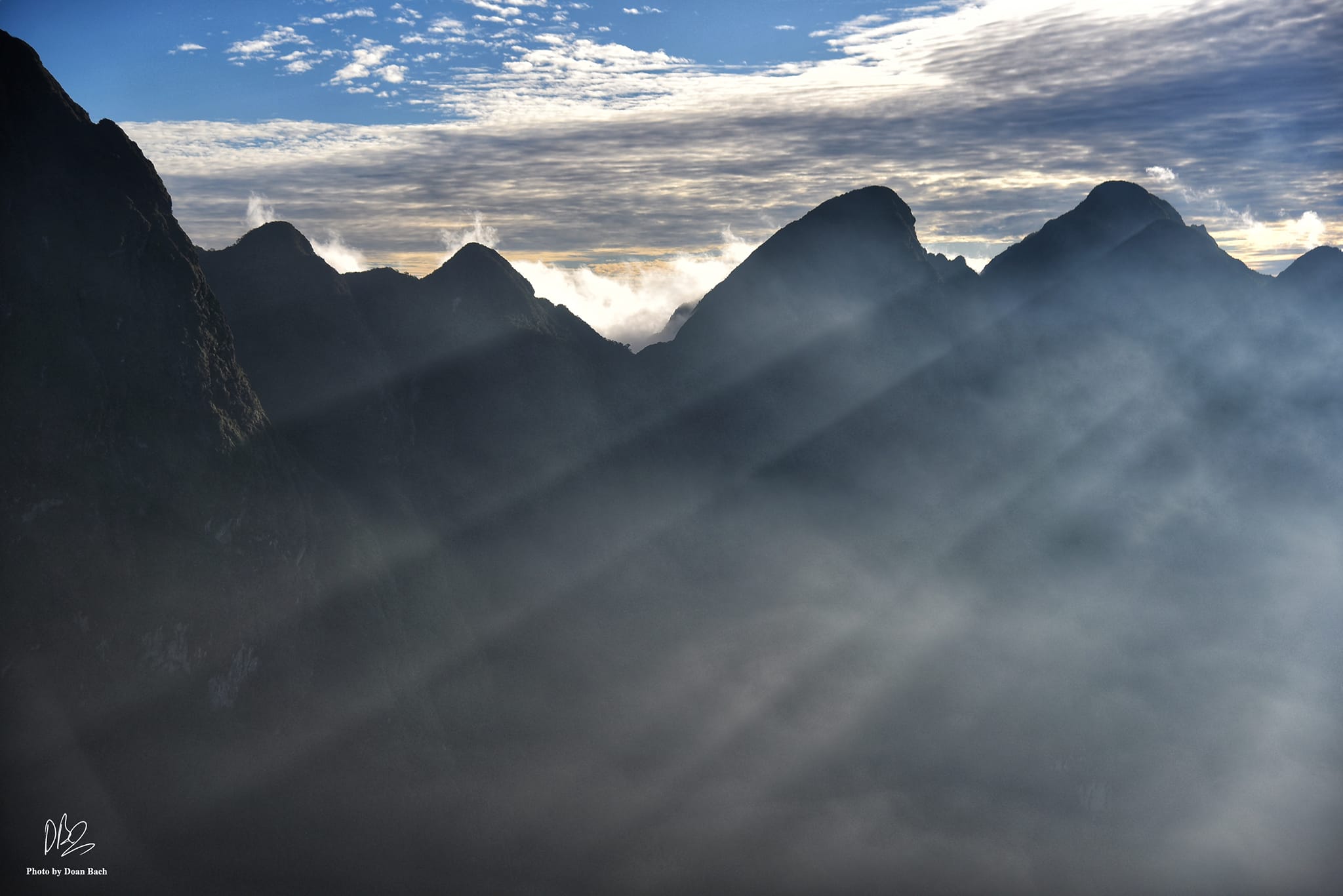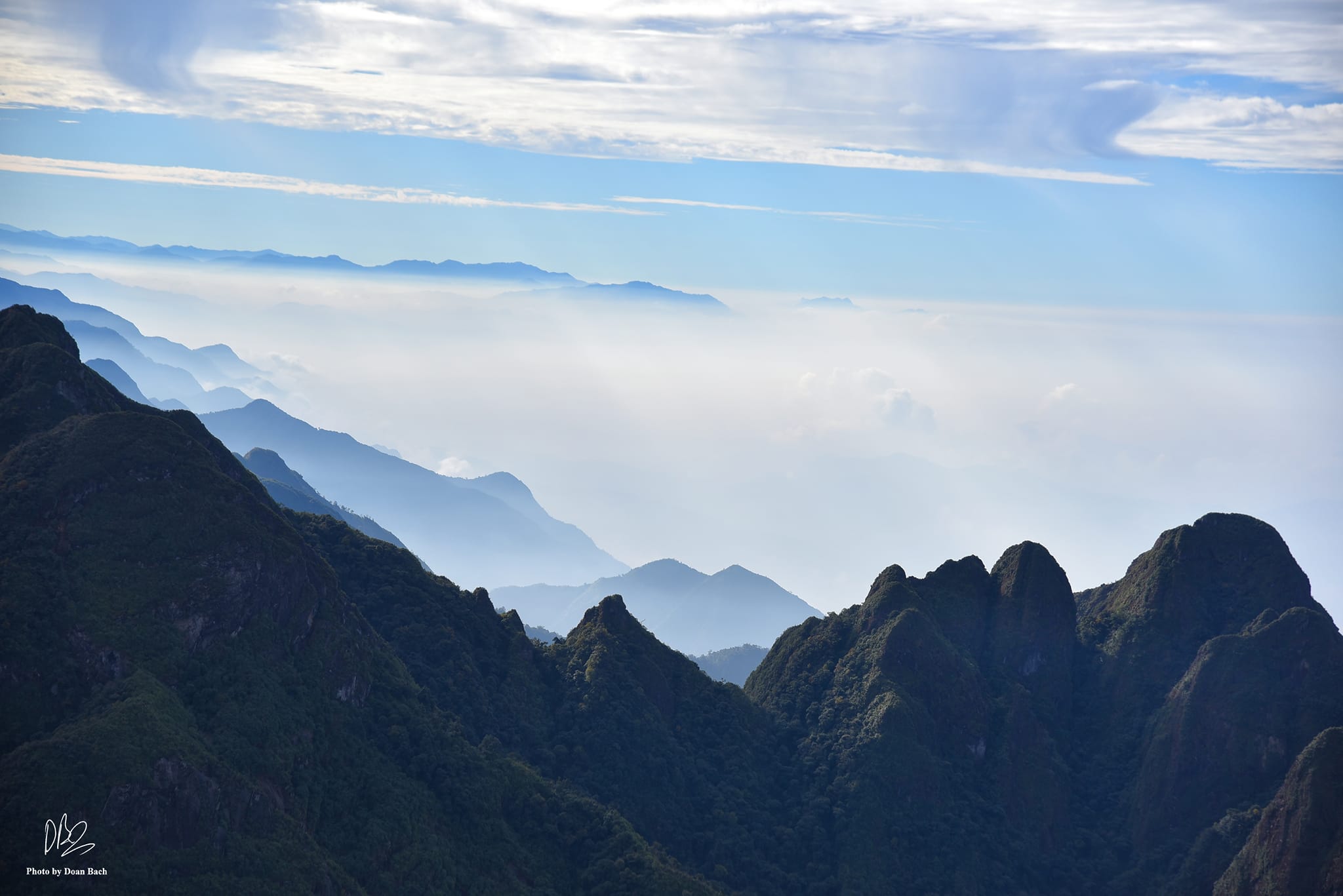 Sau khoảng 40 phút leo với người có sức khoẻ leo trung bình, bọn mình đã có mặt trên đỉnh. Thật may mắn hôm ấy thời tiết khá chiều lòng người. Trời trong xanh, mát mẻ, không quá nóng mà cũng không quá lạnh. Thế nên nhóm chúng tôi ở trên đỉnh gần 2 tiếng đồng hồ để check in và chụp ảnh mà không chán. Góc ngắm trên đỉnh CHUVA siêu rộng, view được cả về 4 phía. Đứng trên đỉnh Chuva 12 bạn có thể ngắm được nóc nhà Đông Dường Fansipan ở rất gần , dãy Ngũ Chỉ Sơn, đỉnh Lảo Thẩn, đỉnh Bạch Mộc,đỉnh Nhìu Cồ San, đỉnh Putaleng, rồi Tả Liên … và vài đỉnh phía xa nữa mình không biết tên. Phóng tầm mắt ra phía xa từng đợt mây bay tràn xuống phía thung lũng, những tầng mây mỏng vắt vẻo qua khe núi . Những luồng ray sáng bình minh chiếu rọi vào mây núi, trông không khác gì những bức tranh thuỷ mặc mà ta vẫn thấy trên phim ảnh. Cảm giác trên đỉnh chỉ có 4 anh em và bạn porter nữa trên đoàn bao trọn cả đỉnh nó đặc biệt vô cùng … Đoạn này chỉ nghĩ đến cảnh ở mấy đỉnh khác, các bạn xếp hàng chen chân chụp check in với chóp mới thấy nhóm mình thật may mắn khi lựa chọn CHUVA .