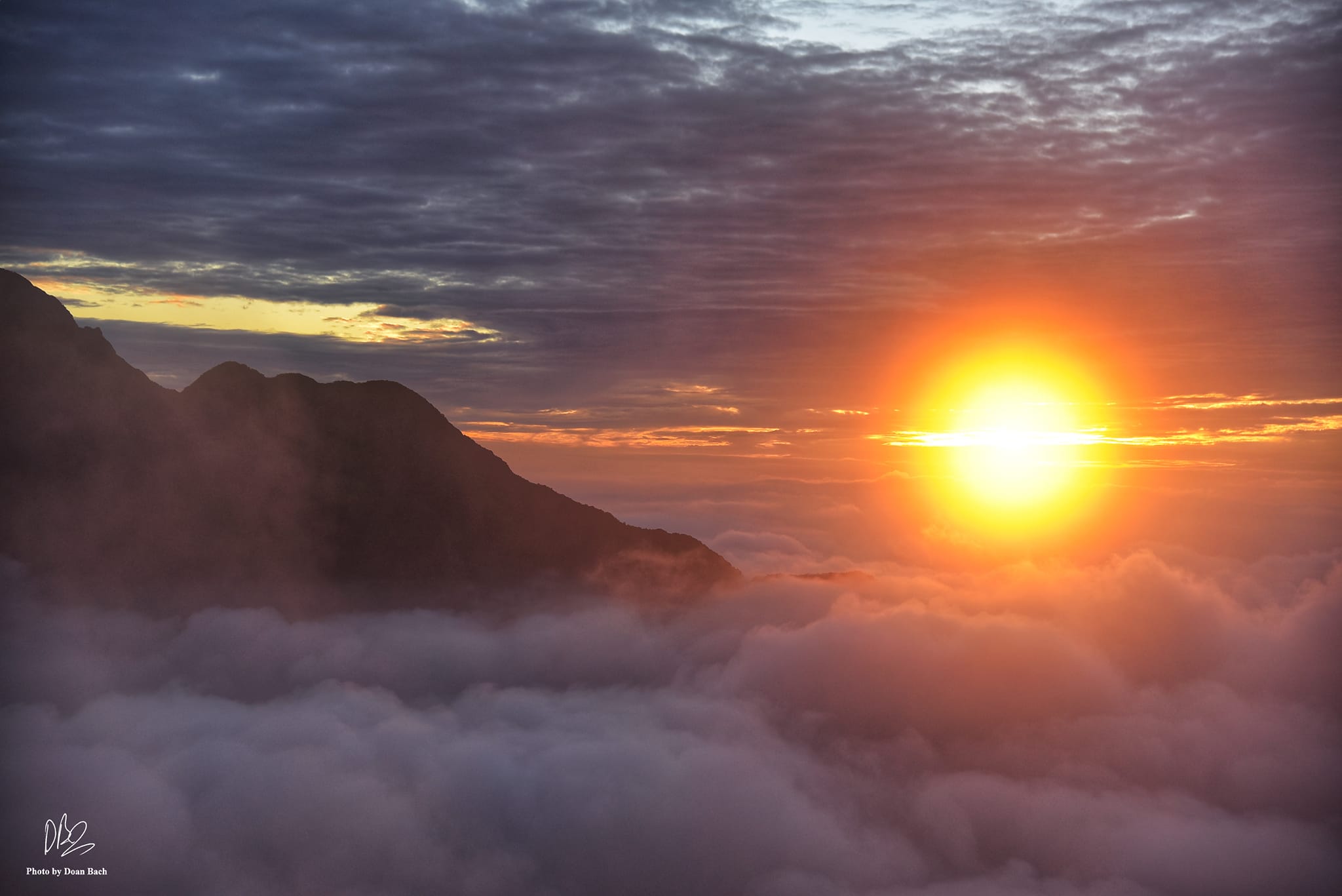 Mới khoảng chưa đến 15h30, cả nhóm mình đã có mặt tại điểm dựng lều và nghỉ của ngày thứ 2. Mọi người nghỉ ngơi, bắt tay vào dựng 2 lều ngủ (1 lều 3 và 1 lầu 4). Ở trên khu này diện tích cũng không quá rộng và thoải mái để dựng lều rộng . Mình ước lượng cỡ đoàn khoảng hơn chục người dựng lều ngủ ở đây là vừa. Hai bạn porter đi kiếm nhặt cành củi khô từ phía xa để đốt bếp nấu nướng chuẩn bị đồ ăn tối. Nước uống và sinh hoạt ở đây cực hiếm và gần như không có, chủ yếu nhờ lượng nước được 2 bạn porter cho vào túi nilon kín, gùi từ lán nghỉ ngày đầu tiên mang sang. Do lều được dựng gần ngay trên đỉnh núi, không có cây to che chắn, thoáng gió nên về đêm sẽ khá lạnh. Hoàng hôn chiều hôm ấy thật đẹp . Phía bên dưới vách núi mây bay từng đám bốc dần lên chỗ chúng tôi ngồi. Mặt trời dần lăn xuống phía chân trời, luồng ánh sáng vàng như mật ong rọi lên từng đám mây. Chúng tôi ngồi ăn tối mà xung quanh như là một đại dương mây bồng bềnh xung quanh. Cảm giác nó thật đặc biệt và yên bình, dường như chỉ muốn thời gian dừng lại nơi đây.