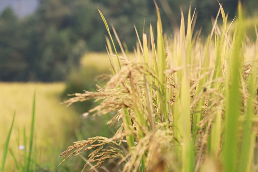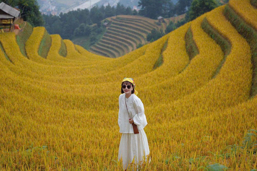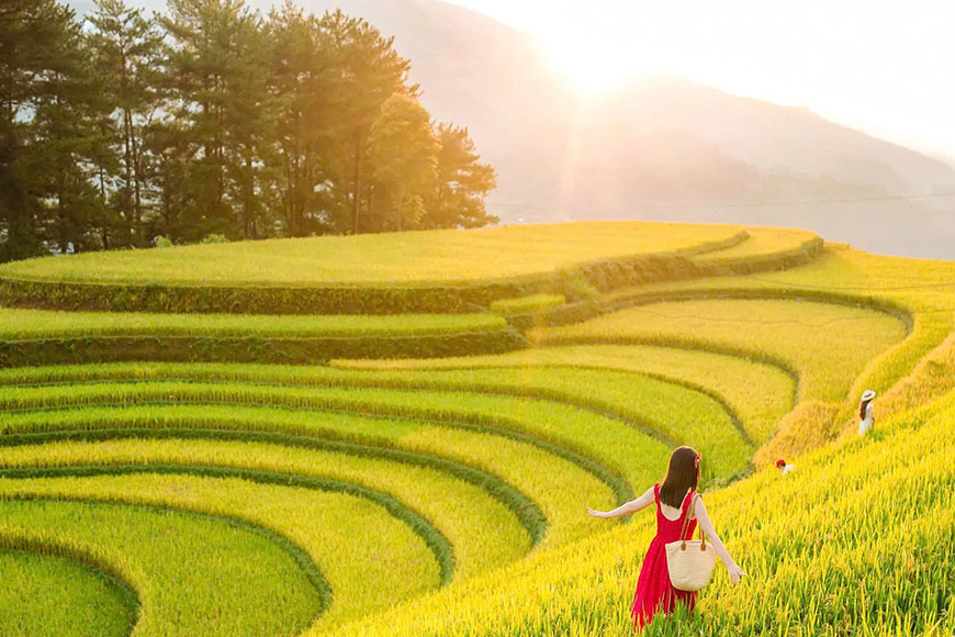 Khoảng thời gian từ giữa tháng 9, những bông lúa bắt đầu ngả vàng, gió thu lướt qua mang theo hương thơm dịu ngọt của hạt nếp nương. Càng bước sang tháng 10, màu vàng ấy càng đậm nét, óng ánh dưới ánh nắng ban mai và càng thêm lung linh trong ánh chiều tà. Sự chuyển mình của thiên nhiên theo từng tuần, từng ngày khiến du khách có cảm giác như đang chứng kiến một bức tranh sống động, thay đổi màu sắc liên tục, từ xanh lẫn vàng đến vàng óng rực rỡ.