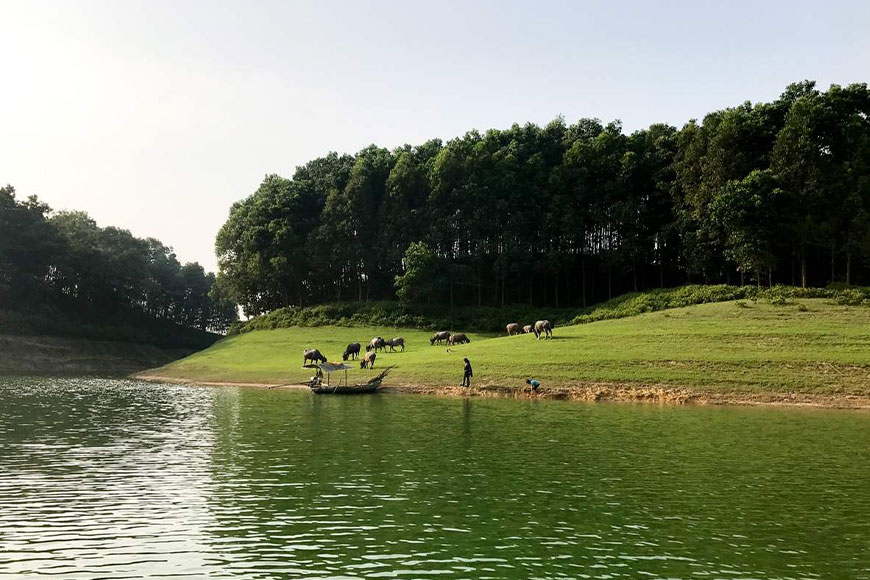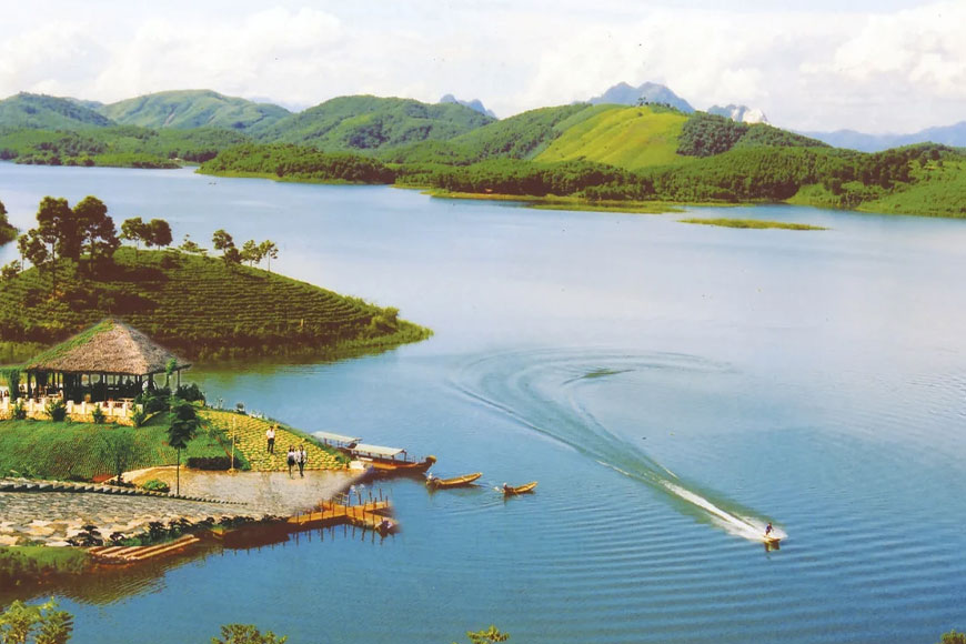 Tâm điểm của vẻ đẹp ấy chính là hồ Thác Bà – mặt gương khổng lồ soi bóng mây trời và rừng cây bất tận. Dưới ánh nắng nhẹ, mặt nước hồ phẳng lặng, trong veo như lớp ngọc thạch dịu dàng, khiến nơi đây trở thành bức tranh thủy mặc sống động, mê hoặc lòng người. Dọc theo bờ hồ, thấp thoáng là những ngôi nhà sàn của người Dao, mái lá nghiêng nghiêng, làn khói lam mỏng nhẹ bay lên từ bếp củi, tạo nên một khung cảnh đậm chất thôn quê nguyên bản mà hiếm nơi nào còn giữ được.
