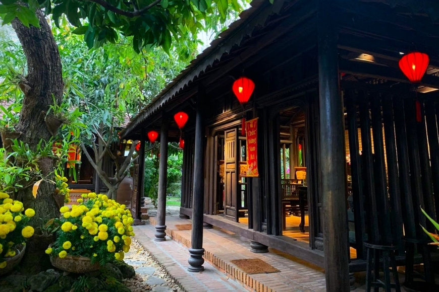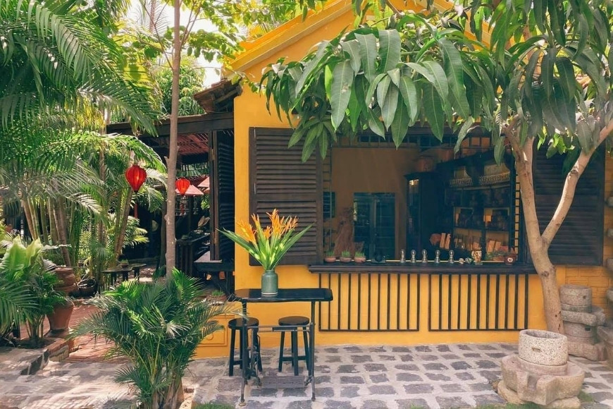 Bước qua cánh cổng gỗ nhuốm màu thời gian, du khách sẽ cảm nhận được ngay một bầu không khí an yên, thanh sạch như tách biệt khỏi thế giới hiện đại. Trong sân vườn rợp bóng cây cổ thụ là những cối xay bột đá, cối quết, hòn đá cà và bàn ghế mây tre dân dã. Mọi vật đều được sắp đặt một cách tinh tế, hài hoà giữa thiên nhiên và không gian cổ, tạo nên một tổng thể vừa mộc mạc vừa thơ mộng khiến ai cũng muốn dừng lại thật lâu.