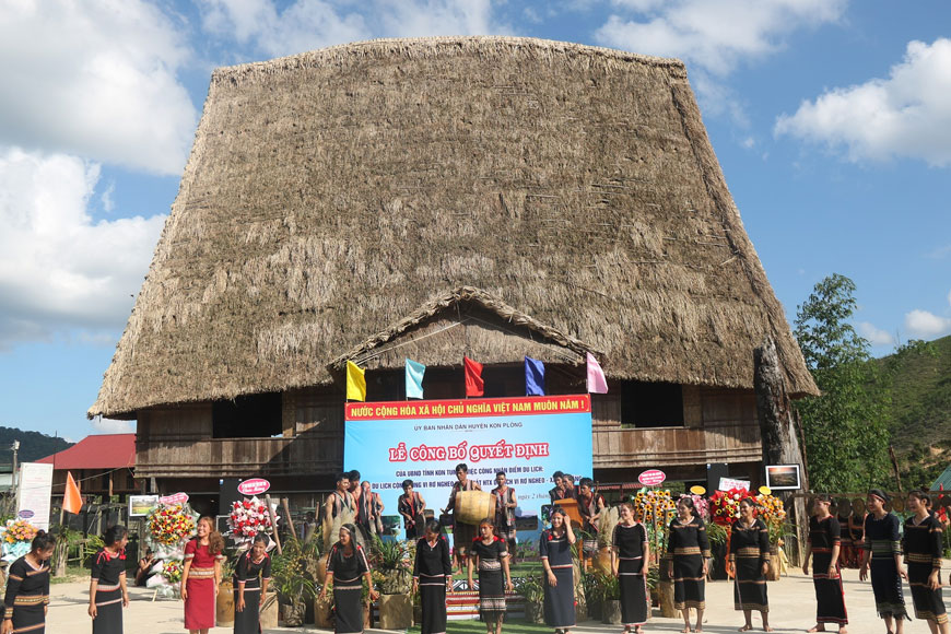 Du khách có thể ghé thăm nhà rông – trung tâm văn hóa và linh hồn của làng. Mái nhà cao vút như vươn chạm mây trời, sàn gỗ mộc, không gian mở, là nơi diễn ra các sinh hoạt cộng đồng quan trọng. Vào buổi sớm, người già thường nhóm bếp, nhâm nhi chút cà phê đắng hoặc nước lá rừng, kể vài câu chuyện cổ tích cho lũ trẻ. Nếu may mắn, bạn có thể được nghe một đoạn cồng chiêng vang vọng trong không gian tĩnh lặng – thứ âm thanh khiến người ta vừa thấy lạ lẫm, vừa thấy thân quen như tiếng gọi từ đại ngàn xa xưa.