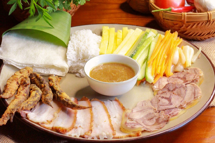 Không ai đến Tây Ninh mà không thử qua bánh tráng phơi sương. Lớp bánh dẻo mềm, thơm mùi gạo mới, gói bên trong là thịt luộc, rau sống và chút chấm mắm me ngọt thanh – giản dị thôi mà gợi cảm giác như đang ngồi bên mâm cơm quê nhà. Cái hay là, ăn món này giữa mùa lễ, khi tâm trạng người ta nhẹ hơn thường nhật, lại thấy nó đặc biệt đến lạ.