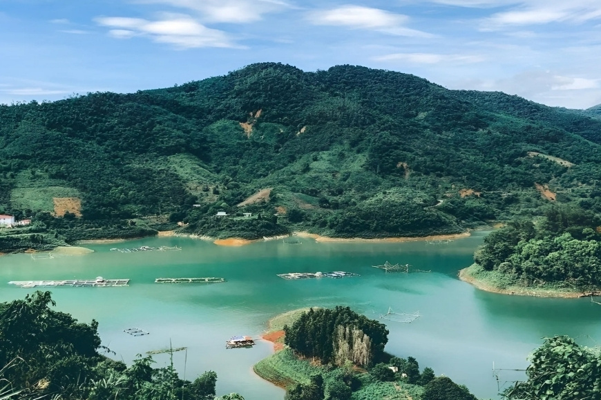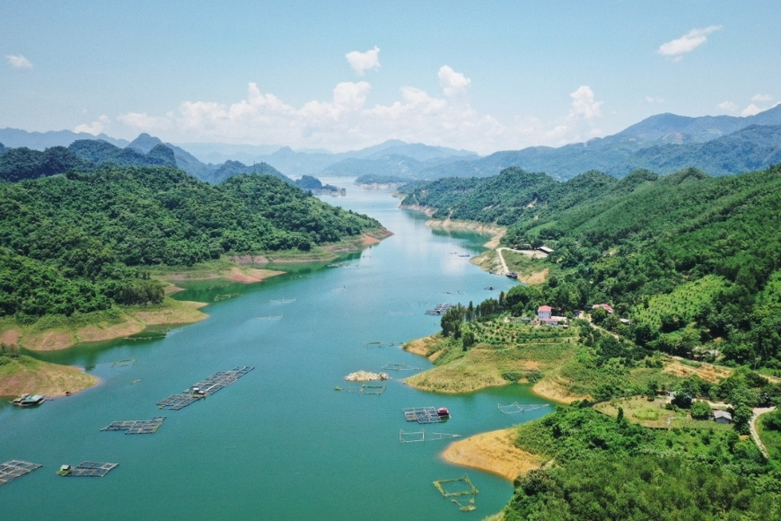 Hồ Thủy điện trải dài trên dòng sông Đà hùng vĩ, mang trong mình vẻ đẹp sơn thủy hữu tình, lặng lẽ nhưng đầy nội lực. Giữa làn nước xanh biếc là 47 hòn đảo lớn nhỏ như những viên ngọc nổi lên giữa lòng hồ, mỗi đảo là một mảng màu trong bức tranh thiên nhiên hùng vĩ. Từ trên cao nhìn xuống, mặt nước hồ như tấm gương phản chiếu mây trời, khiến bất kỳ ai cũng phải ngẩn ngơ trước cảnh tượng nên thơ ấy.