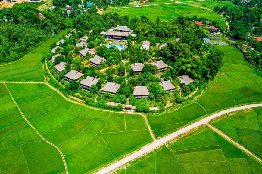 Nép mình giữa thung lũng Mai Châu xanh thẳm, Mai Châu Ecolodge là sự giao thoa tuyệt vời giữa nghỉ dưỡng đẳng cấp và trải nghiệm sinh thái bền vững. Các bungalow được xây dựng hoàn toàn bằng vật liệu tự nhiên như tre, nứa, đá ong và mái lá cọ, hòa vào cảnh sắc núi non yên bình tạo nên cảm giác vừa sang trọng, vừa gần gũi. Mỗi căn phòng đều có ban công riêng nhìn ra cánh đồng lúa trải dài, nơi bình minh và hoàng hôn đều trở thành những khoảnh khắc thiêng liêng.