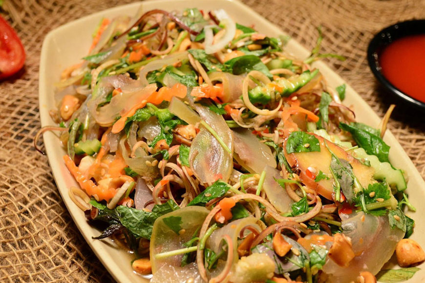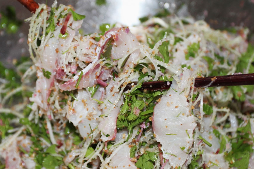 Sông Lô nổi tiếng với cá bỗng – loài cá thịt chắc, thơm, ít xương dăm. Người dân nơi đây sáng tạo ra món gỏi cá bỗng độc đáo: thịt cá tươi thái lát mỏng, cuốn cùng lá sung, lá mơ, khế chua và chấm với chẩm chéo. Đặc biệt, xương cá được rang giòn, giã nhỏ thay cho thính gạo, tạo vị béo ngậy rất riêng. Khi đưa vào miệng, vị ngọt mát của cá hòa cùng vị chua, cay, thơm của lá rừng, khiến gỏi cá bỗng trở thành một trải nghiệm khó quên.