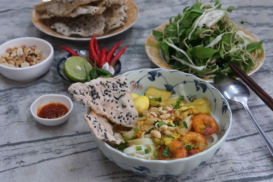 Nhắc đến đặc sản Quảng Ngãi, chắc chắn không thể bỏ qua món mì quảng trứ danh. Đây không chỉ là món ăn, mà còn là linh hồn ẩm thực của vùng đất miền Trung đầy nắng gió. Mì quảng ở Quảng Ngãi mang nét riêng khó lẫn, với sợi mì bản to, có màu trắng đục hoặc vàng nhẹ nếu được trộn thêm chút bột nghệ. Sợi mì mềm dai, thơm nhẹ mùi gạo, ăn kèm nước dùng đậm đà ninh từ xương heo, vừa ngọt thanh vừa béo nhẹ, tạo nên hương vị khó quên. Điểm đặc biệt là topping đa dạng như tôm đất tươi, thịt heo rim, trứng cút, rắc thêm đậu phộng rang giã dập và rau sống tươi xanh. Thưởng thức cùng bánh tráng mè nướng giòn rụm, bẻ vụn rắc lên mặt tô mì, tất cả hòa quyện tạo nên một bản giao hưởng vị giác đậm chất Quảng Ngãi mà ai ăn một lần cũng khó quên.