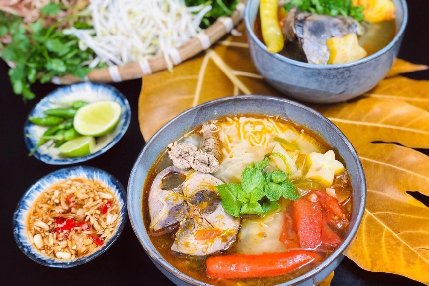 Bún cá ngừ um là một trong những món ăn đặc sản mang đậm hương vị miền biển của Quảng Ngãi. Cá ngừ được chọn là loại cá tươi, thịt chắc, được um kỹ với dứa và gia vị tạo nên vị ngọt thanh, hơi chua và thơm lừng hấp dẫn. Mỗi tô bún là sự kết hợp hài hòa giữa lát cá um mềm ngon, bún tươi trắng mịn, cùng rau sống gồm xà lách, bắp chuối, húng quế và giá đỗ. Điểm nhấn của món ăn còn nằm ở chén nước mắm ớt đậm đà, cay nồng làm tăng thêm phần hấp dẫn. Thưởng thức bún cá ngừ um, thực khách không chỉ cảm nhận được cái tinh tế trong cách chế biến mà còn thấy rõ sự bình dị, thân quen của ẩm thực Quảng Ngãi.