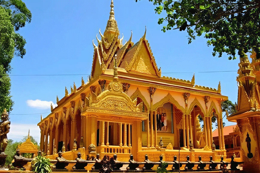 Được nhiều bạn trẻ gọi là “thiên đường check-in”, chùa Som Rong nổi bật với tượng Phật nằm dài 63 mét, một trong những tượng lớn nhất khu vực. Không gian chùa vừa hiện đại vừa giữ nét truyền thống, với sắc vàng rực rỡ, mái cong đặc trưng và sân chùa rộng thoáng. Ngoài pho tượng khổng lồ, nơi đây còn lưu giữ nhiều giá trị tinh thần của Phật giáo Nam tông Khmer. Khi bước vào chùa, du khách có thể cảm nhận được sự giao thoa giữa đời sống tín ngưỡng lâu đời và nhịp sống hiện đại, biến ngôi chùa thành điểm dừng chân khó thể bỏ qua.