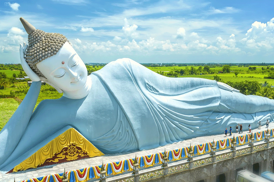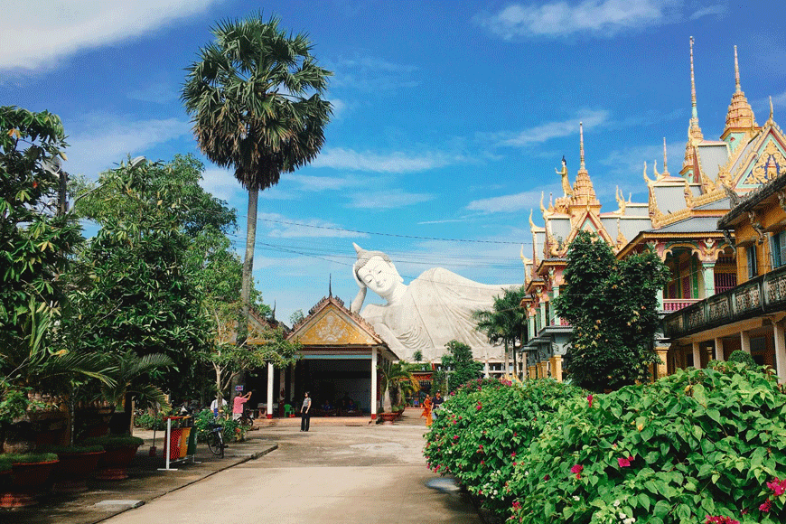 Đến với chùa Som Rong, hình ảnh đầu tiên khiến du khách không khỏi choáng ngợp chính là pho tượng Phật nằm khổng lồ dài 63 mét, cao 22,5 mét, sừng sững giữa khoảng trời rộng lớn. Tượng được đặt trên bệ cao, hướng gương mặt từ bi ra xa như che chở muôn đời cho người dân vùng đất này. Đây không chỉ là công trình tôn giáo quy mô bậc nhất miền Tây mà còn là “background” tuyệt đẹp cho những bức hình check-in đầy ấn tượng. Vào buổi chiều, khi ánh nắng vàng rót xuống bức tượng trắng muốt, khung cảnh ấy gợi nên sự thiêng liêng và bình yên khó tả.
