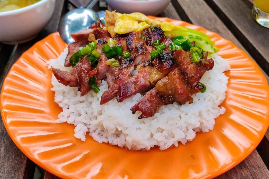 Thịt heo thái lát mỏng, ướp với nước mắm ngon, đường thốt nốt, tỏi băm, sả để tạo độ ngọt và mùi thơm. Khi nướng trên than hồng, thịt xém cạnh, tỏa hương hấp dẫn. Cơm trắng nóng hổi ăn kèm thịt nướng, thêm chút dưa leo, cà chua và chén nước mắm chua ngọt tạo nên bữa ăn vừa đủ chất vừa dễ ăn. Trong những ngày lễ, đĩa cơm thịt heo nướng không chỉ là món ăn mà còn là lời mời chân thành của gia chủ dành cho khách.