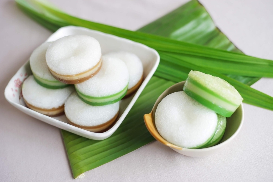 Bánh được làm từ bột gạo, bột năng, nước cốt dừa và đường, pha màu từ nguyên liệu tự nhiên. Hỗn hợp bột được đổ từng lớp mỏng vào khuôn và hấp chín, cứ một lớp chín mới rưới tiếp lớp khác, tạo thành những tầng rõ nét. Khi ăn, bánh mềm mịn, hơi dai, vị ngọt dịu hòa với mùi thơm của nước cốt dừa và lá dứa. Đây là món vừa đẹp vừa ngon, không quá ngọt nên dễ ăn, và thường được cắt thành miếng vuông hoặc hình thoi để bày biện trên bàn tiệc lễ hội.