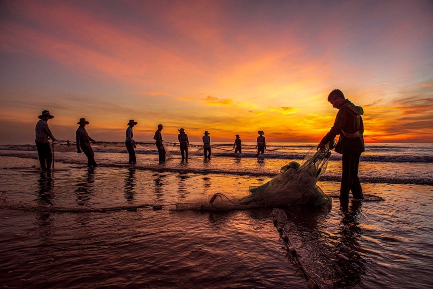 Một trong những hình ảnh ấn tượng và đậm chất đời thường nhất khi đến biển Xuân Hải chính là cảnh “kéo lưới bằng cơm” – cách gọi dí dỏm để chỉ công việc kéo lưới hoàn toàn bằng sức người. Mỗi buổi sớm, khi ánh bình minh vừa ló rạng, cả làng chài lại cùng nhau quây quần bên bờ biển, tay nắm chặt những sợi dây thừng nặng trĩu, phối hợp nhịp nhàng trong tiếng hò reo rộn rã để kéo từng mẻ lưới lớn vào bờ. Cảnh tượng ấy không chỉ thể hiện sự đoàn kết, bền bỉ của ngư dân mà còn mang đến cho du khách cảm giác gần gũi, chân thực về cuộc sống lao động của người dân miền biển. Không khí nhộn nhịp ấy, từ tiếng hò kéo lưới, tiếng gọi nhau í ới đến âm thanh rộn ràng của chợ cá ven biển, tất cả tạo nên một bức tranh sinh động, đầy sức sống và ấm áp tình người.