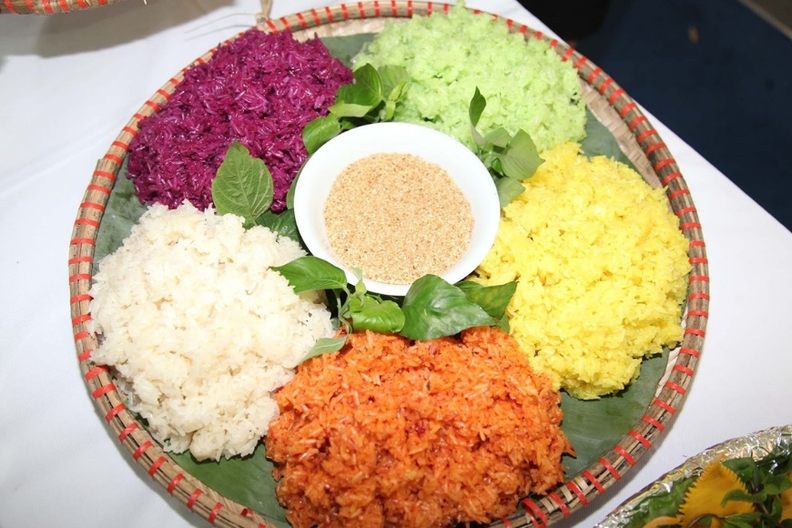 Xôi ngũ sắc không chỉ ngon mà còn đẹp như một tác phẩm nghệ thuật. Khi bày ra đĩa, bà con tuân theo một quy tắc riêng: màu trắng đặt ở trung tâm, tượng trưng cho sự tinh khiết và tinh túy của trời đất; bốn màu còn lại xếp thành vòng tròn bên ngoài, đại diện cho bốn phương, bốn mùa trong năm. Đĩa xôi vì thế không chỉ đẹp mắt như bông hoa năm cánh khoe sắc, mà còn gói ghém triết lý ngũ hành: đỏ là hỏa, đen (tím) là thủy, trắng là kim, vàng là thổ, xanh là mộc.