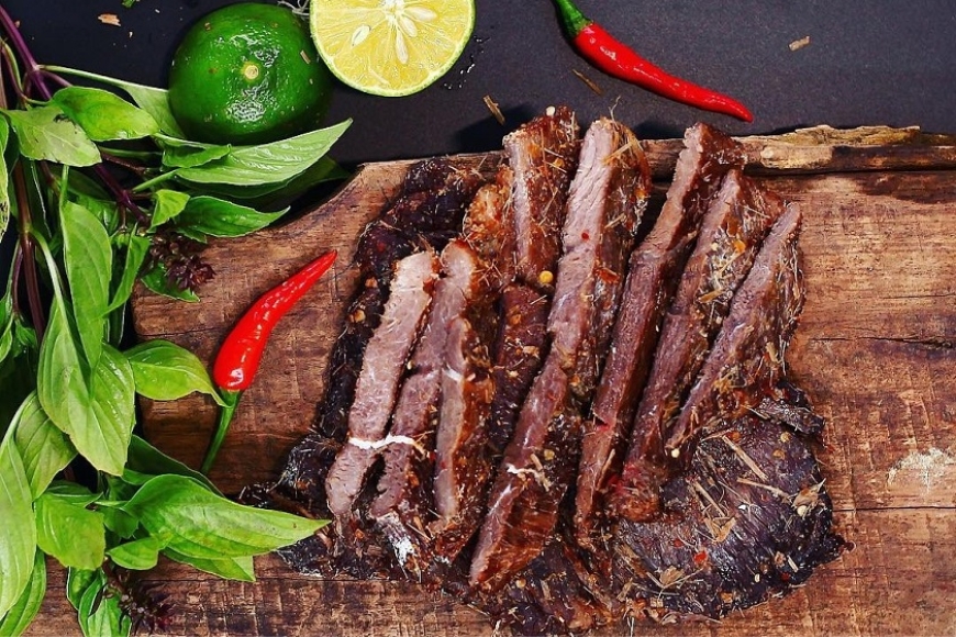 Bò một nắng Đắk Lắk là món đặc sản khiến bất kỳ ai thưởng thức cũng phải xuýt xoa vì độ thơm ngon độc đáo. Để có được miếng thịt ngon đúng chuẩn, người ta phải chọn loại bò được chăn thả tự nhiên ở vùng núi Sơn Hòa, nơi những con bò lớn lên giữa thiên nhiên trong lành. Thịt sau khi làm sạch sẽ được tẩm ướp gia vị theo công thức riêng, rồi đem phơi dưới nắng gắt ban ngày và hong sương mát về đêm. Chính sự tỉ mỉ trong quá trình “một nắng hai sương” đã tạo nên hương vị thơm nồng, đậm đà khó cưỡng của món ăn này. Khi thưởng thức, bò một nắng thường được nướng lên cho dậy mùi, rồi chấm cùng muối kiến vàng – một loại muối độc đáo được làm từ kiến, trứng kiến, sả, ớt…Từng miếng thịt bò dai mềm hòa quyện với vị chua cay mặn ngọt của muối kiến vàng, chắc chắn sẽ mang đến trải nghiệm ẩm thực “có một không hai” tại Đắk Lắk.