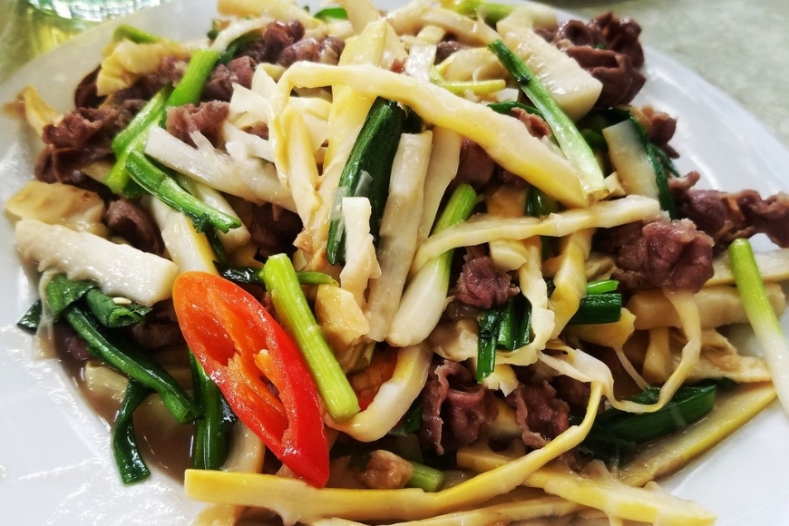 Thịt trâu vốn đã là đặc sản nổi tiếng của miền núi, khi kết hợp với măng chua Tuyên Quang lại càng thêm phần độc đáo. Thịt trâu thái lát mỏng, xào nhanh tay trên lửa lớn với măng chua và các loại gia vị như gừng, sả, ớt, tạo nên hương vị vừa đậm đà vừa nồng nàn. Miếng thịt trâu chắc, ngọt, hòa quyện với măng chua giòn giòn, khiến bữa cơm thêm phần hấp dẫn.