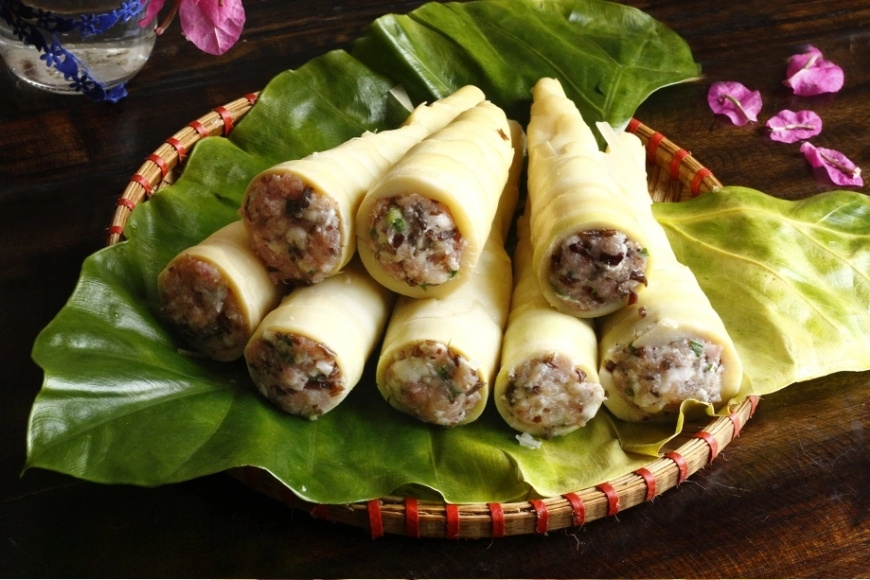 Đây là món ăn thể hiện sự khéo léo của người nội trợ Tuyên Quang. Không chỉ đẹp mắt mà còn giàu dinh dưỡng, măng nhồi thịt thường được chế biến để đãi khách quý. Miếng măng vàng nhạt, bao bọc lớp nhân hồng hào, hương thơm dậy lên khiến bất kỳ thực khách nào cũng muốn thưởng thức ngay từ lần đầu tiên nhìn thấy.