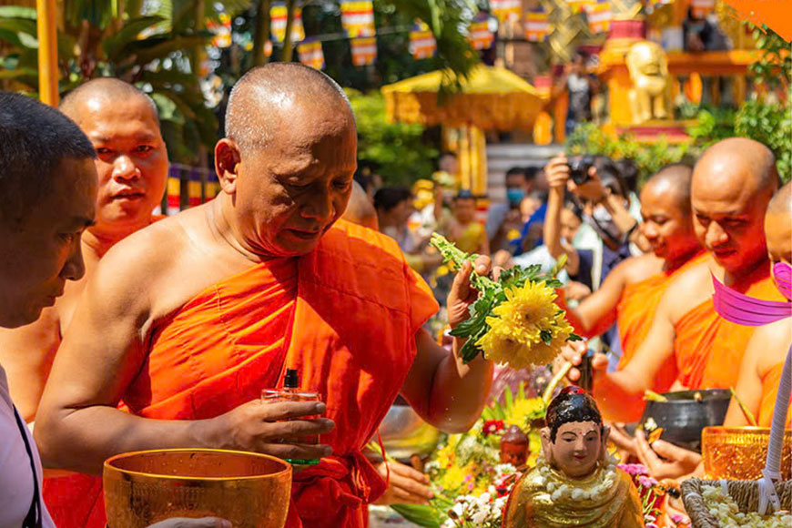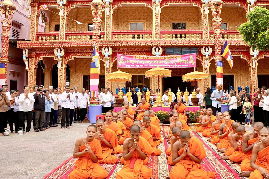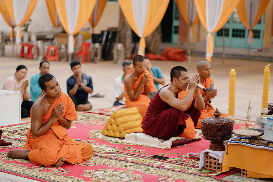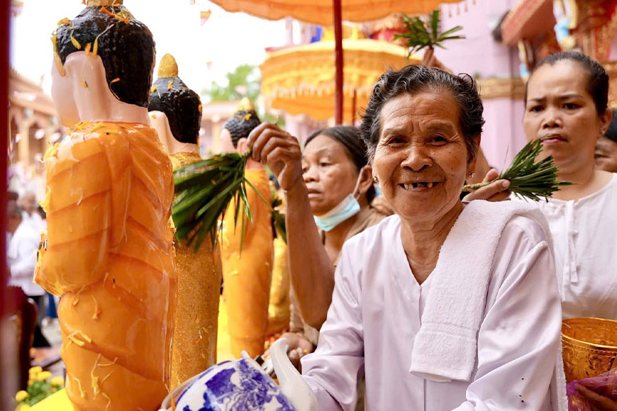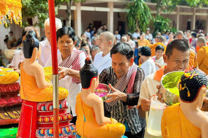 Không khí tại các ngôi chùa như chùa Monivongsa Bopharam trở nên đặc biệt sinh động trong ngày này. Người dân Khmer, từ già đến trẻ, cùng nhau dọn dẹp, trang hoàng chùa chiền, dựng cờ phướn ngũ sắc, bày mâm trái cây tươi ngon, chuẩn bị nhang đèn, nước thơm, hoa tươi tất cả tạo nên một không gian lễ hội đầy sắc màu và trang nghiêm.