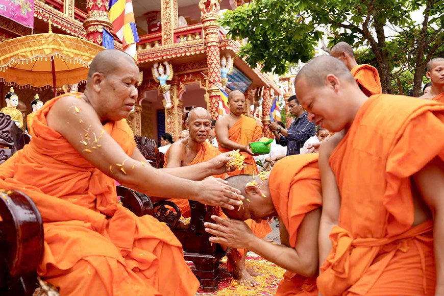 Cùng ngày, một nghi thức sâu sắc không kém là lễ Băngskôl – cầu siêu cho người đã khuất tại tháp cốt trong chùa. Thân nhân mang lễ vật đến chùa, dâng cơm, thắp nhang, tụng kinh để hồi hướng công đức cho ông bà tổ tiên, hành động nhắc nhở thế hệ con cháu về đạo lý “uống nước nhớ nguồn”. Đặc biệt, nghi thức tắm tổ tiên và mừng tuổi cũng được diễn ra trong không khí trang trọng tại gia đình. Con cháu rửa chân, xoa nước thơm và chúc thọ cha mẹ, ông bà hành động nhỏ nhưng chan chứa nghĩa tình, gói ghém trọn vẹn sự biết ơn và gắn bó gia đình.