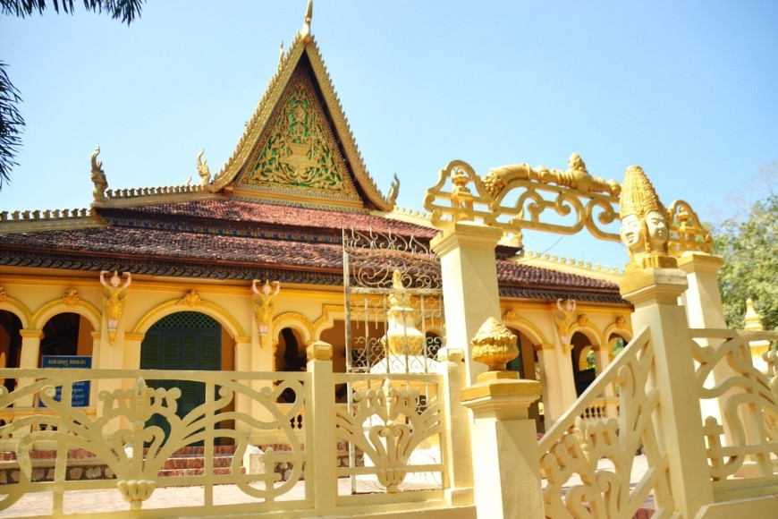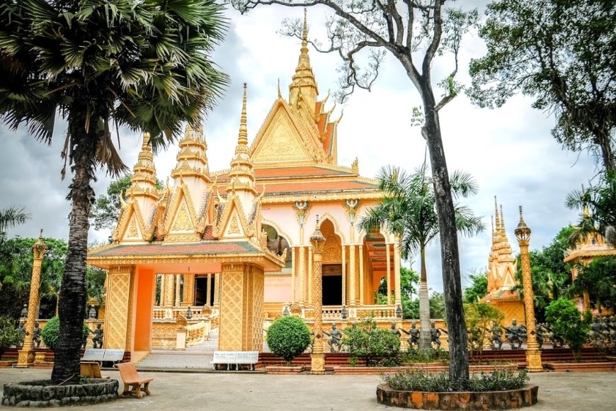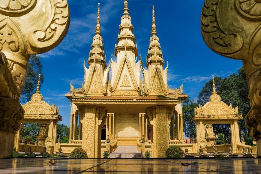 Được xem là ngôi chùa Khmer lớn nhất Việt Nam, chùa Vàm Ray gây ấn tượng ngay từ xa với gam màu vàng rực rỡ và kiến trúc tráng lệ, khiến bất cứ ai cũng phải ngước nhìn. Với những người trưởng thành ở độ tuổi xế chiều, không gian nơi đây gợi mở cảm giác uy nghi, choáng ngợp nhưng cũng đầy trang nghiêm, như một cõi riêng để tạm gác bỏ phiền muộn. Những chi tiết điêu khắc cầu kỳ, tượng Phật khổng lồ cùng hàng trụ cột chạm trổ tinh vi đưa du khách vào thế giới của niềm tin và lòng từ bi.