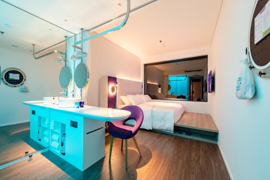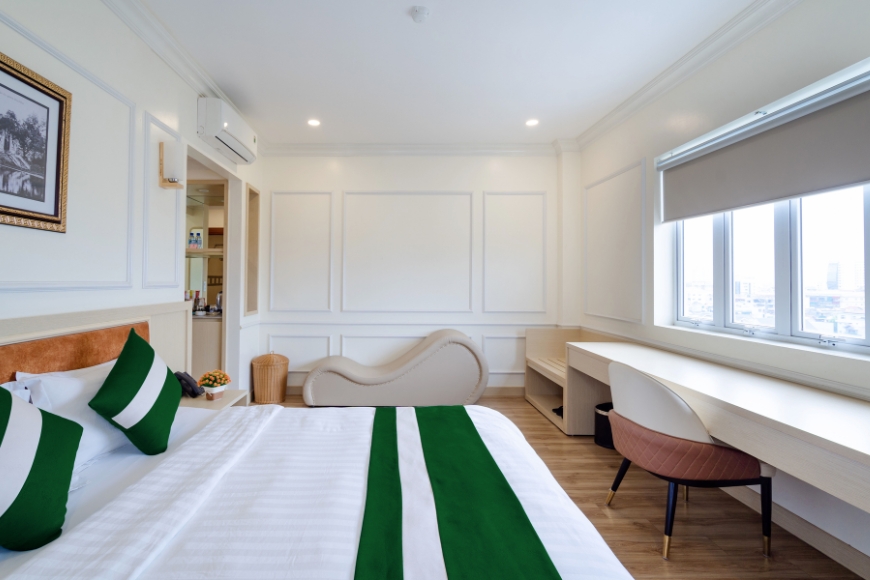 Hệ thống phòng nghỉ tại khách sạn được trang bị đầy đủ tiện nghi như máy điều hòa, bàn làm việc, minibar, két an toàn, TV màn hình phẳng và phòng tắm riêng. Đặc biệt, một số phòng còn có khu vực bếp với lò vi sóng, tủ lạnh và lò nướng, mang lại sự tiện lợi tối đa cho khách lưu trú dài ngày. Bên cạnh đó, khách sạn còn có vị trí thuận lợi khi nằm ngay đối diện trung tâm thương mại Vincom, xung quanh là các nhà hàng và quán cà phê đẹp, giúp du khách dễ dàng khám phá ẩm thực và không gian sống động của thành phố.