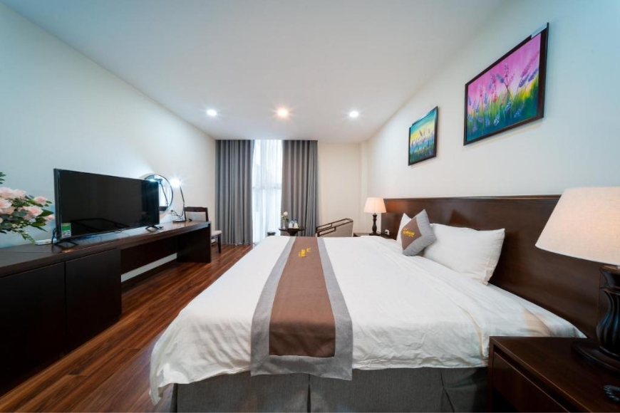 Khách sạn sở hữu 2 phòng Junior, 36 phòng Deluxe và 11 phòng tiêu chuẩn, tất cả đều có không gian thoáng mát và tầm nhìn đẹp. Đặc biệt, nhà hàng tại đây phục vụ cả ẩm thực Á – Âu, phù hợp cho những bữa tiệc sinh nhật, chiêu đãi hay hội nghị quan trọng. Đội ngũ nhân viên chuyên nghiệp, tận tâm cũng là một điểm cộng lớn, mang lại sự hài lòng cho khách hàng.