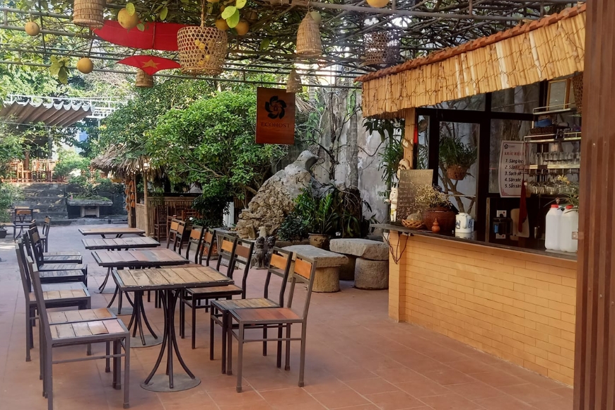 Không gian bên ngoài của Ecohost rộng rãi, thoáng đãng, với sân vườn xanh mát, bao quanh là cây cối tươi tốt, tạo nên một không gian yên bình lý tưởng để thư giãn. Bên cạnh đó, quầy bar và quán cà phê tại Ecohost là những điểm đến lý tưởng để bạn thư giãn, nhâm nhi ly cà phê trong không gian gần gũi với thiên nhiên.