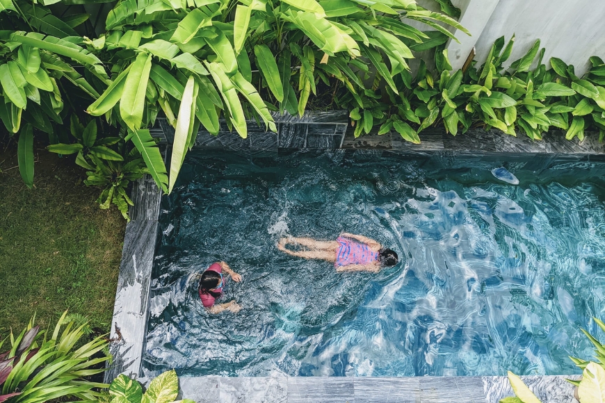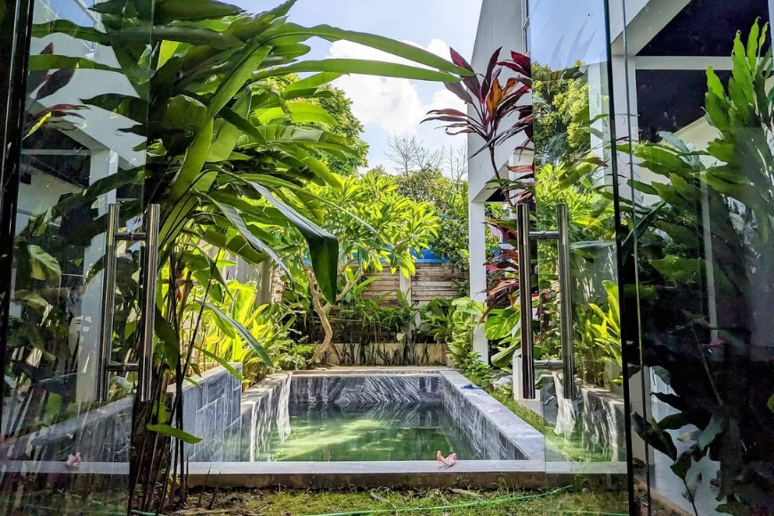 Ngoài ra, khuôn viên ngoài trời của homestay cũng là một điểm cộng lớn với bể ngâm rộng 18m², sân BBQ, võng thư giãn, bàn ăn ngoài trời và một chiếc lều chụp ảnh xinh xắn bên hồ xanh. Bể ngâm có thể phục vụ 4–6 người cùng lúc, lý tưởng để vừa vui chơi vừa tận hưởng khí trời mát mẻ. Đến với Rocco Villa Quất Lâm, bạn không chỉ có nơi nghỉ dưỡng tiện nghi mà còn có vô số góc sống ảo đẹp mê hồn để lưu giữ những khoảnh khắc đáng nhớ bên người thân, bạn bè.