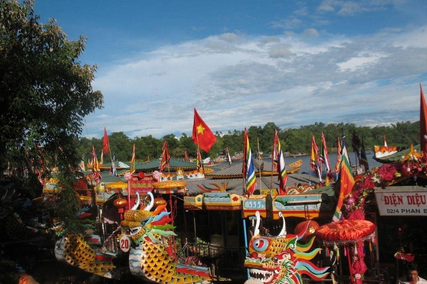 - Du ngoạn bằng thuyền rồng trên sông Hương: Đây là phương tiện phổ biến và được nhiều người yêu thích khi đến Điện Hòn Chén. Bạn có thể xuất phát từ bến Tòa Khâm hoặc bến thuyền gần chùa Thiên Mụ, thuê thuyền rồng để đi thẳng đến bến Điện Hòn Chén.