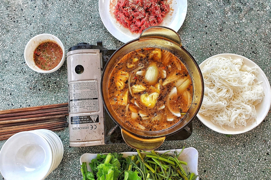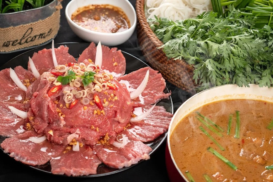 Trong hành trình khám phá ẩm thực TP.HCM, lẩu bò nhúng mắm ruốc là món ăn đặc sản không thể bỏ qua. Món ăn này nổi bật với nguyên liệu chính là thịt bò tươi ngon cùng mắm ruốc được làm từ con ruốc, một loại tôm nhỏ đặc trưng của miền Nam. Nước dùng lẩu hòa quyện giữa vị béo của thịt ba chỉ, tóp mỡ, hương thơm nồng nàn của sả, ớt, hành tây và vị mặn mà đậm đà của mắm ruốc tạo nên một trải nghiệm ẩm thực khó quên. Khi thưởng thức, bạn có thể cuốn thịt bò đã nhúng nước lẩu cùng bún tươi, rau thơm và bánh tráng, cảm nhận vị ngọt dịu của thịt bò hòa cùng vị cay nhẹ và mặn mòi đặc trưng của nước dùng. Lẩu bò nhúng mắm ruốc chính là món ăn lý tưởng để thưởng thức trong những ngày mưa hay thời tiết se lạnh, mang đến sự ấm áp và hài lòng cho mọi thực khách.