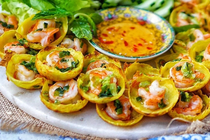 Nhắc đến đặc sản TP.HCM làm say lòng du khách thì không thể không kể đến bánh khọt. Bánh khọt được làm từ bột gạo hoặc bột sắn, nhân bánh thường là tôm tươi hoặc thịt cùng với các loại nguyên liệu khác, ăn kèm rau sống tươi ngon. Món bánh nổi bật với lớp vỏ ngoài vàng ruộm bắt mắt, thơm phức. Tôm trên mặt bánh được chiên đến khi cháy xém, giòn tan hòa quyện cùng chút mỡ hành béo ngậy làm ai cũng phải nhớ mãi. Điểm đặc biệt tạo nên sức hút của món ăn chính là phần nước mắm chua ngọt vừa miệng, giúp tăng thêm vị ngon và khiến bánh khọt trở thành món ăn được nhiều người yêu thích.