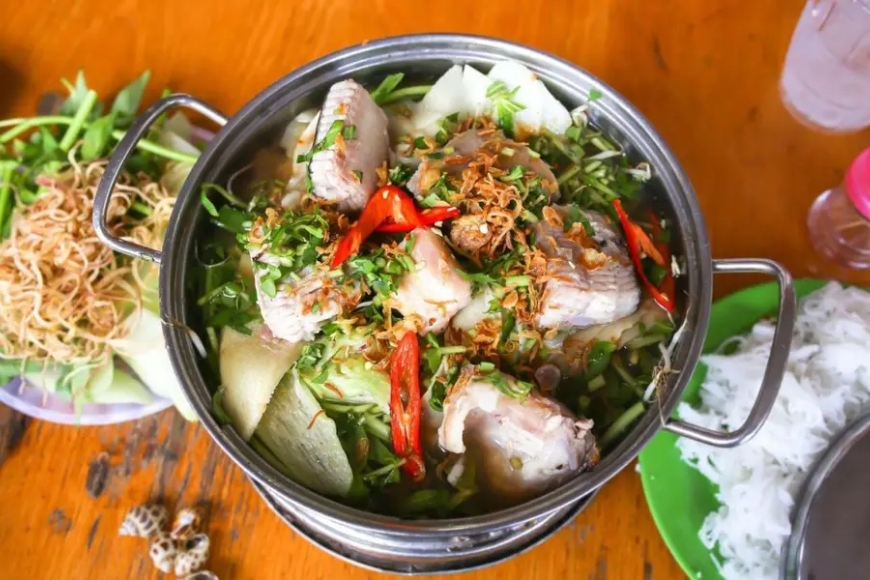 Không chỉ có cá đuối, nồi lẩu còn đầy ắp các loại topping đi kèm như tóp mỡ giòn rụm, măng tươi thanh mát, rau muống xanh mướt, kết hợp cùng mì tôm hoặc bún, tạo nên một hương vị hài hòa, vừa lạ vừa quen. Một nồi lẩu nhỏ dành cho 2–3 người thưởng thức trong những ngày se lạnh thực sự là lựa chọn lý tưởng để cả nhóm cùng quây quần và thưởng thức.