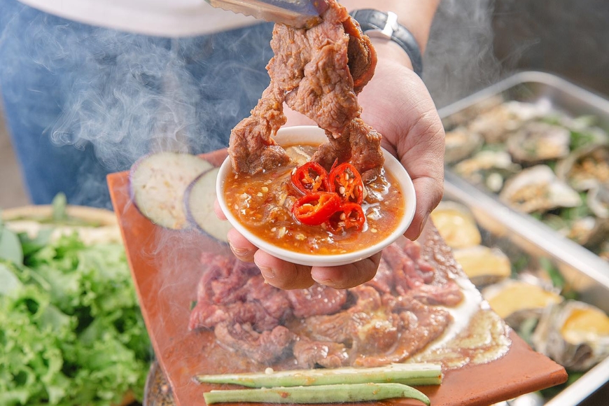 Đúng như tên gọi, bò nướng ngói là món ăn độc đáo được chế biến ngay trên miếng ngói nóng hổi. Viên bò đã được chuẩn bị sẵn với lớp mỡ mỏng, vì vậy khi đặt lên ngói, thịt tự tan chảy, tỏa ra hương thơm nồng nàn mà không cần thêm dầu mỡ. Chỉ vài phút thôi, khói bốc lên nghi ngút, lan tỏa mùi thơm hấp dẫn khiến bất cứ ai cũng phải xiêu lòng. Thưởng thức bò nướng ngói, thực khách không thể thiếu rau thơm, bánh tráng và mắm nêm để cuốn. Khi tất cả hòa quyện, từng miếng bò ngọt mềm, kết hợp cùng vị chát nhẹ của chuối xanh, vị chua dịu của khế và hương mắm nêm đặc trưng, tạo nên một trải nghiệm ẩm thực đậm đà, khó quên.
