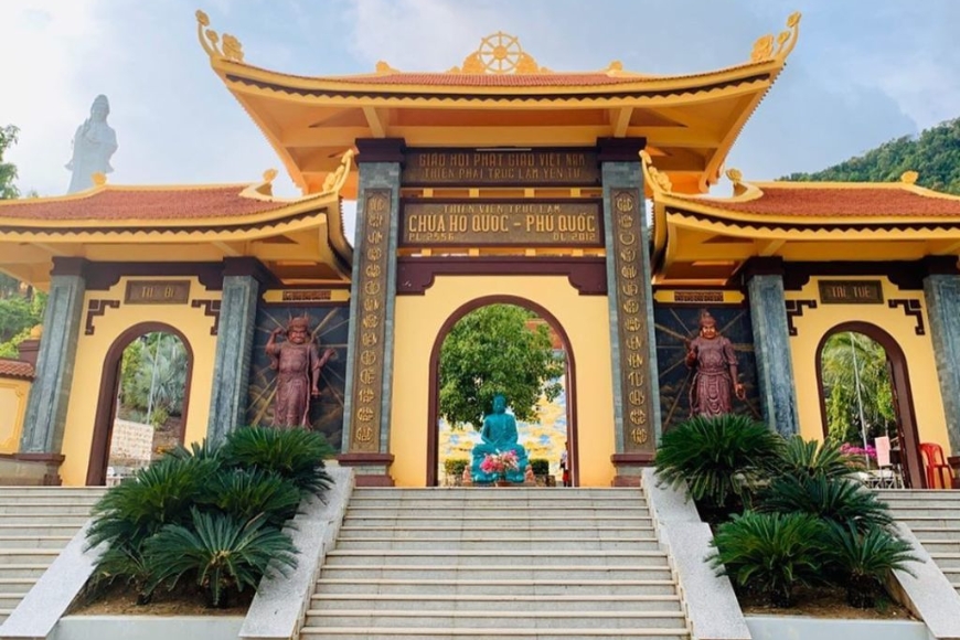 Tìm về bình yên tại Chùa Hộ Quốc Phú Quốc, ngôi chùa hướng biển nổi tiếng với kiến trúc cổ kính và khung cảnh nên thơ.