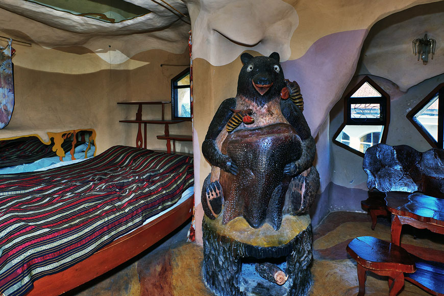 Khám phá kiến trúc độc đáo: Du khách có thể dành thời gian chiêm ngưỡng các chi tiết kiến trúc kỳ lạ, từ hành lang uốn lượn đến những căn phòng với thiết kế lấy cảm hứng từ thiên nhiên và động vật.