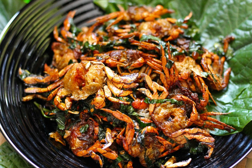 Cua đồng rang lá lốt là món ăn dân dã, gợi nhớ đến bữa cơm quê hương yên bình. Những con cua đồng nhỏ được làm sạch, tẩm ướp gia vị như mắm, tiêu, và hành băm. Lá lốt tươi được thái sợi nhỏ, chuẩn bị để rang cùng cua.