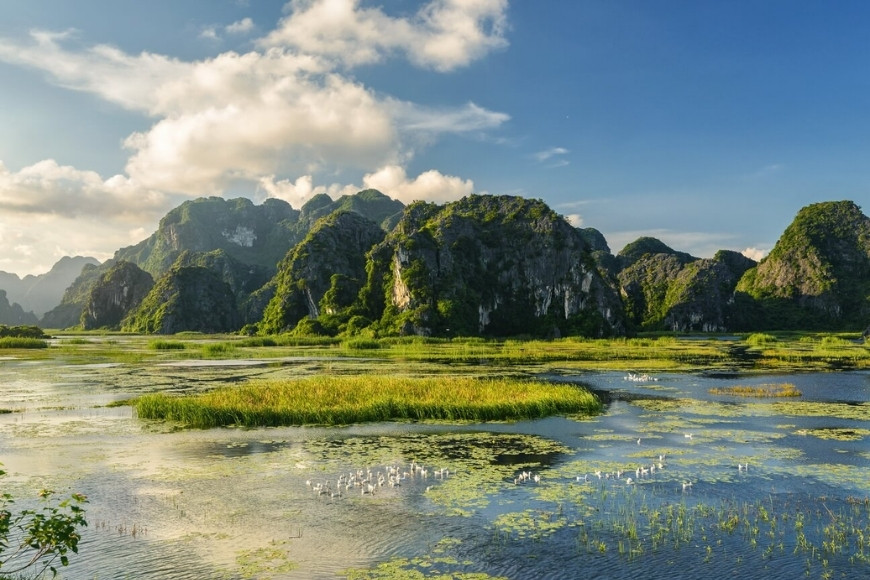 Đầm Vân Long là khu bảo tồn thiên nhiên đất ngập nước lớn nhất miền Bắc, với hệ sinh thái phong phú và cảnh quan thơ mộng. Được ví như “vịnh không sóng,” đầm Vân Long gây ấn tượng bởi mặt nước phẳng lặng như gương, phản chiếu núi đá vôi và bầu trời xanh thẳm. Đây còn là nơi cư trú của nhiều loài động vật quý hiếm, đặc biệt là voọc mông trắng – loài linh trưởng có nguy cơ tuyệt chủng.Đến đây, du khách sẽ được trải nghiệm đi thuyền trên mặt nước yên ả, ngắm nhìn hệ động thực vật và những cảnh quan núi non tuyệt đẹp.